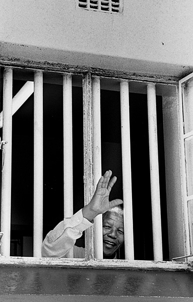 South African president Nelson Mandela revisits his prison cell on Robben Island, where he spent eighteen of his twenty-seven years in prison. Information or Purchase Request