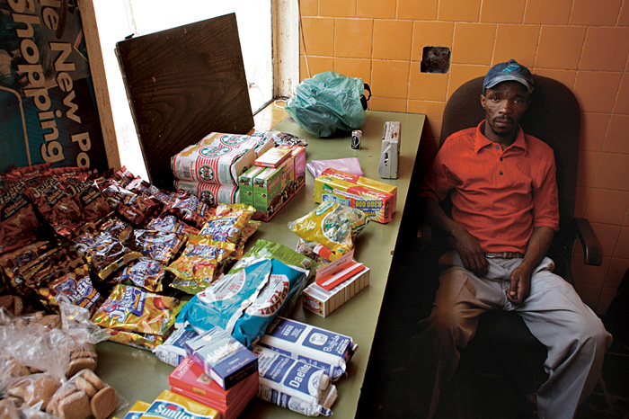 Eric Thomo runs a Spaza Shop from his room in the San Jose apartment block, Johannesburg. The shop can bring in R400 a month. He has lived here for 3 years. Information or Purchase Request