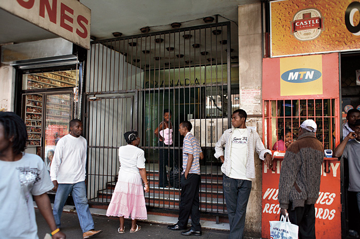A woman safe behind the bars of her apartment block on the main shopping street in the Hillbrow district of Johannesburg. Information or Purchase Request