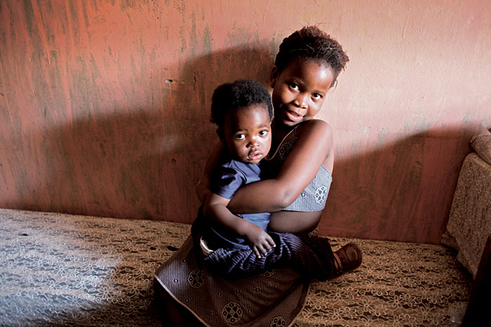 Nompumelelo Khumalo (7), and Dumisani Mxunu (20 months), at home in Milton Court, Johannesburg. The children in this block don't attend school due to lack of funds. Information or Purchase Request