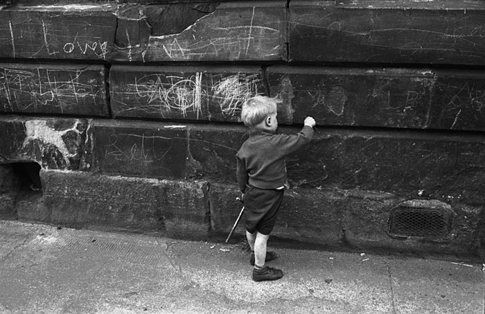 A little boy adds his mark to the writing on a wall in the Gorbals area of Glasgow. Information or Purchase Request