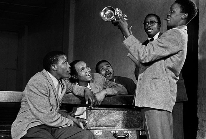The young Hugh Masekela receives the trumpet from Satchmo, a gift organised by Father Trevor Huddleson, an avid supporter of African jazz and founder of the Huddleson Jazz Band Information or Purchase Request