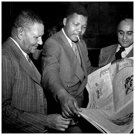 Nelson Mandela (centre) with ANC President, Dr J.S. Moroka (left) and President of the Indian National Congress, Yusuf Dadoo (right) helped organise the Defiance Campaign in 1952. Mandela wrote an article 'We Defy' in Drum in August 1952, explaining his struggle "...for freedom and national independance of the non-European people".