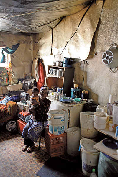 Joyce Nzama (43), and baby Lulama (3), at Ginwell house in Johannesburg where she has lived for 6 years. Joyce is unemployed and fetches water for the neighbours earning R5 per 20 litres or a food contribution. Information or Purchase Request
