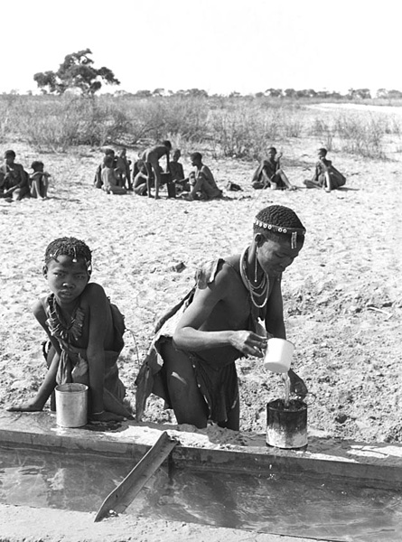 Water is a precious commodity in the Kalahari. A group of travelling San stock up with water supplies at a borehole near Lonetree Pan. Information or Purchase Request