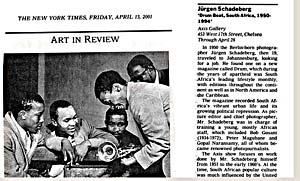 New York Times Friday, 13 April, 2001 Art in Review Jurgen Schadeberg ‘Drumbeat, South Africa, 1950 -1994” Axis Gallery By Holland Cotter |